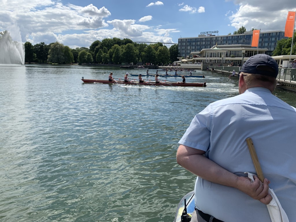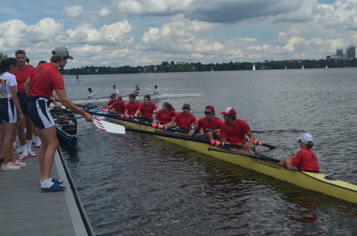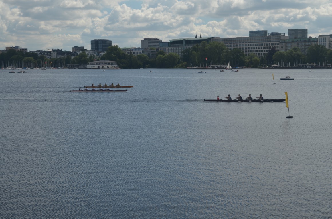 Bei strahlendem Sonnenschein und anspruchsvollem Gegen- bis Seitenwind fand zwei Tage vor dem Start der Sommerferien in Hamburg der Landesentscheid „Jugend trainiert für Olympia“ auf der Außenalster statt. Gestartet wurde, wie üblich, kurz vor dem Fähranleger „Alte Rabenstraße“ und die Ziellinie befand sich auf Höhe des Ruder Clubs Favorite Hammonia, welcher sein Vereinsgelände freundlicherweise wieder zur Verfügung stellte.