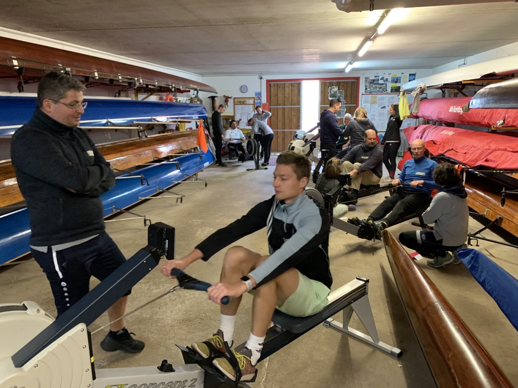 Es folgte der Komplex „Ergometerrudern“. Marcus Weber, Protektor der ASS, hatte in der Bootshalle acht Ergometer aufgebaut. Nach einer kurzen theoretischen Einweisung wurde in Kleingruppen an der Technik gearbeitet. Danach wurden – als Anregungen für mögliche Unterrichtsinhalte – verschiedene Belastungen gefahren.