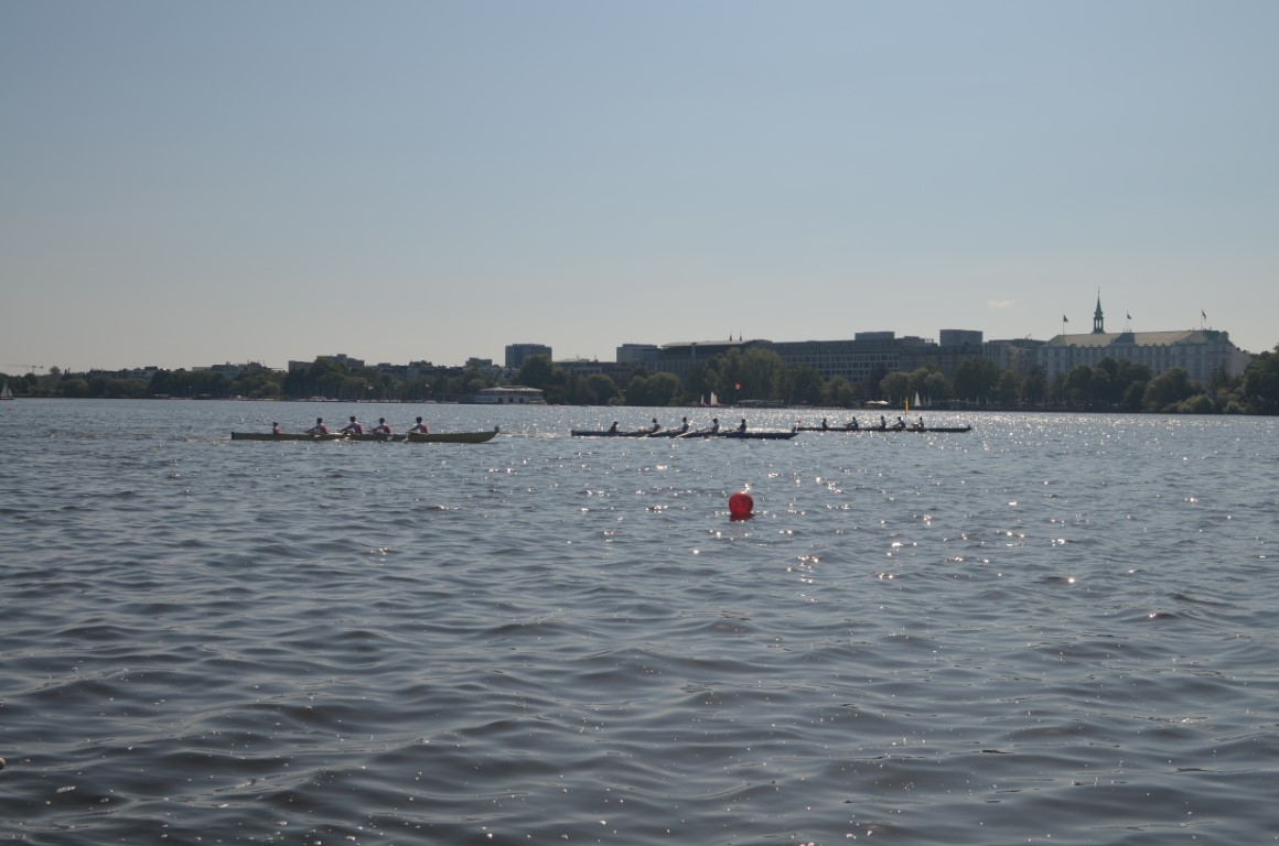 Bei strahlendem Sonnenschein und sommerlichen Temperaturen versammelten sich dieses Jahr wieder die ruderbegeisterten Schüler*innen von 14 beteiligten Schulen mit ihren Obleuten an der Außenalster. Der Ruder-Club Favorite Hammonia (Fari) und der Hamburger und Germania Ruder Club (Club) stellten freundlicher Weise wieder Stege und Vereinsgelände zur Verfügung, so dass ein recht reibungsloser Ablauf trotz der Größe des diesjährigen Meldefeldes von 122 Booten und insgesamt 630 Rollsitzen gewährleistet werden konnte.