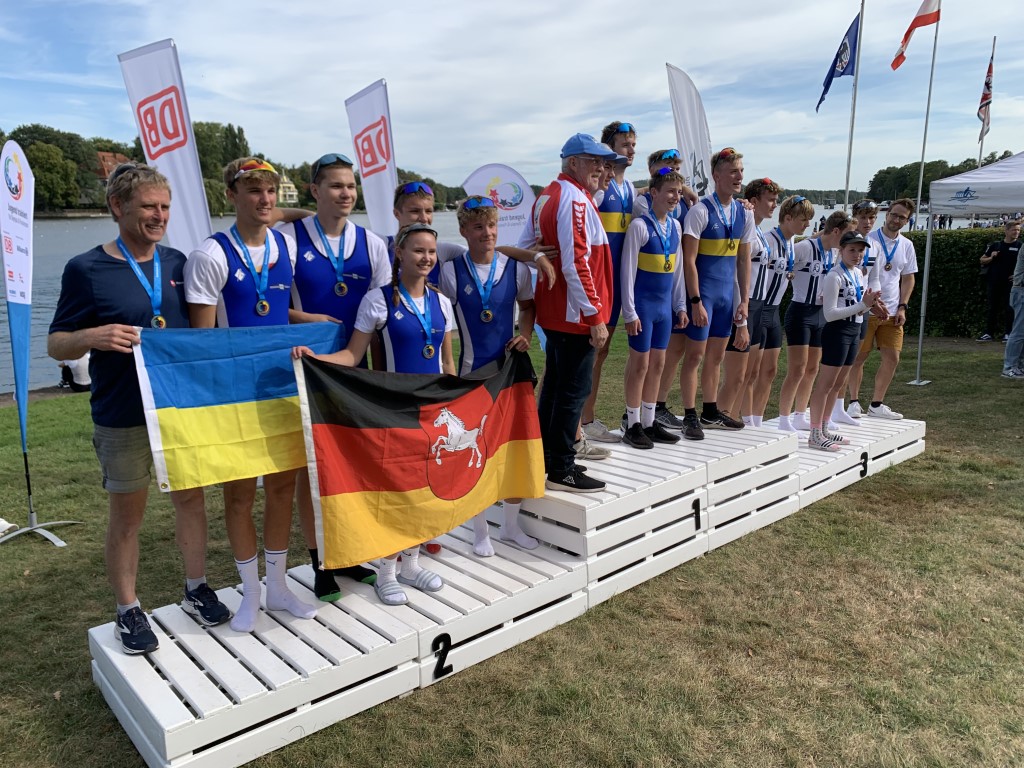 Beitragsbild: Im Schülerinnen-Achtercup siegte Hanau vor Hannover und Hamburg, links JtfO-Pate Max Munski sowie hockend vom Ruder-Club Deutschland Michael Buchheit und rechts Mattes Schönherr, Schlagmann des Deutschlandachters.